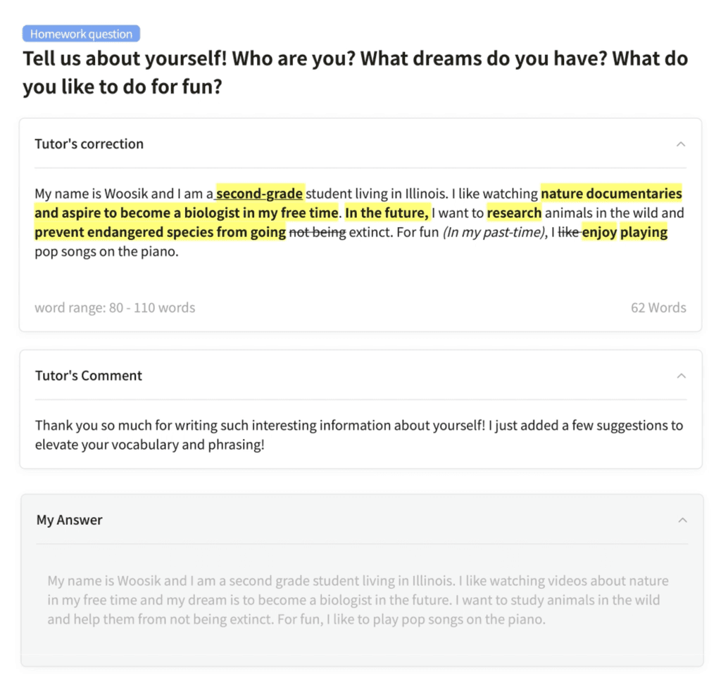 • 학원에서 단어만 외우다가 튜터랑 이야기도 하고 내가 쓰고 싶은 글도 쓰니까 훨씬 재미있는 것 같아요. 어떤 생각을 말해도 다 잘 들어주고 친한 형, 누나랑 수다 떨듯이 영어 공부해서 좋아요.